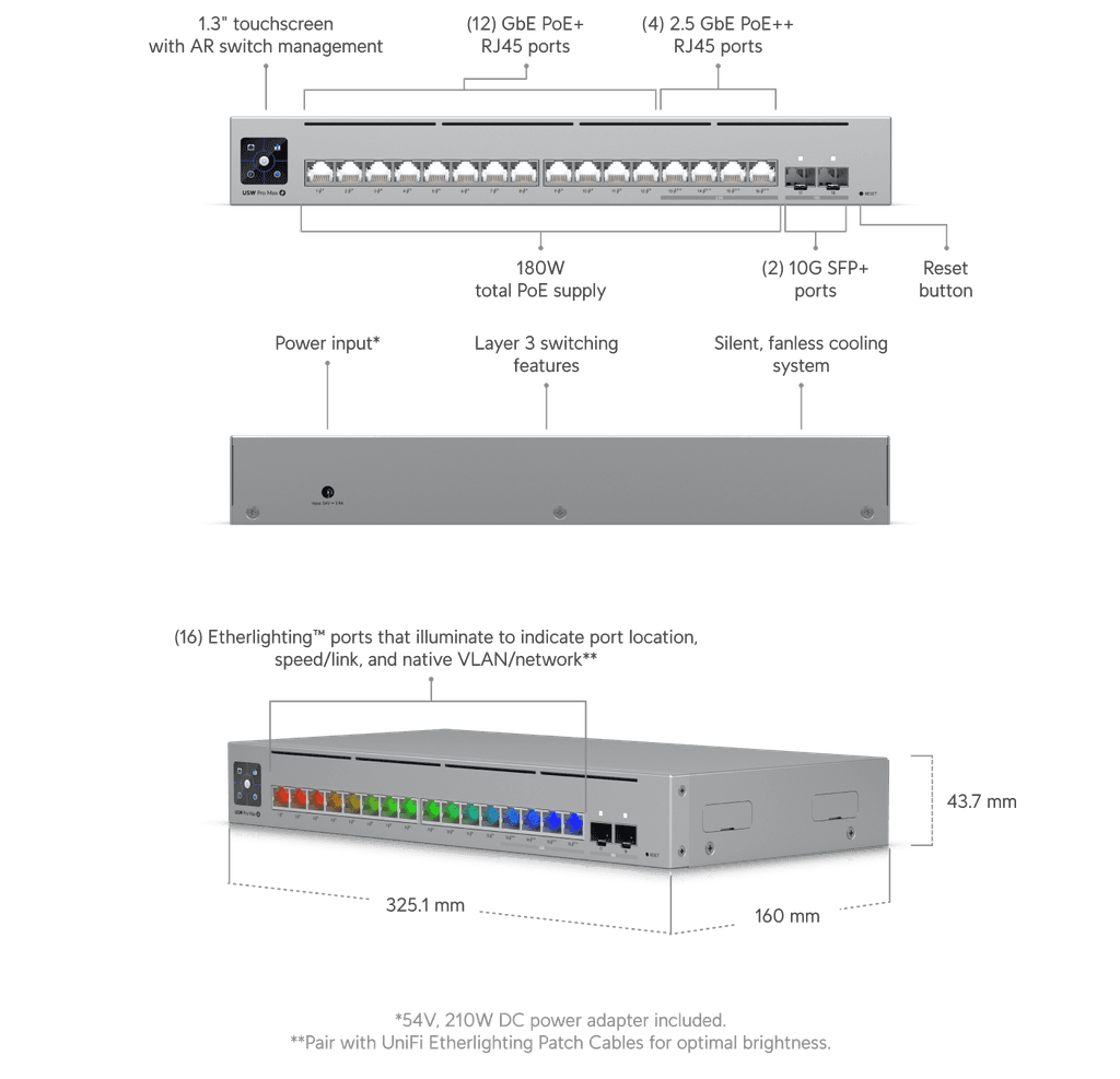 Ubiquiti UniFi Network,Pro Max 16 PoE Switch,16-port, Layer 3 Etherlighting, 2.5 GbE, PoE++ Output, Versatile Mounting Option,180W PoE, 2Yr Warr