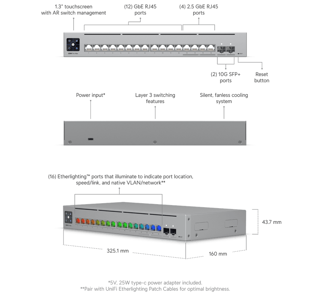 Ubiquiti UniFi Network,Pro Max 16 Switch,16-port, Layer 3 Etherlighting, 2.5 GbE, Power Supply 5V, 25W, Versatile Mounting Options.2Yr Warr Promo