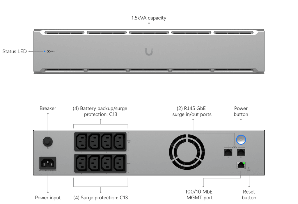 UniFi managed 1.44kVA rackmount uninterruptible power supply with 8 outlets and field replaceable battery, 216Wh, half load (500W) runtime of 8 minutes, UniFi Alarm Manager ready and NUT support for 3rd party devices.